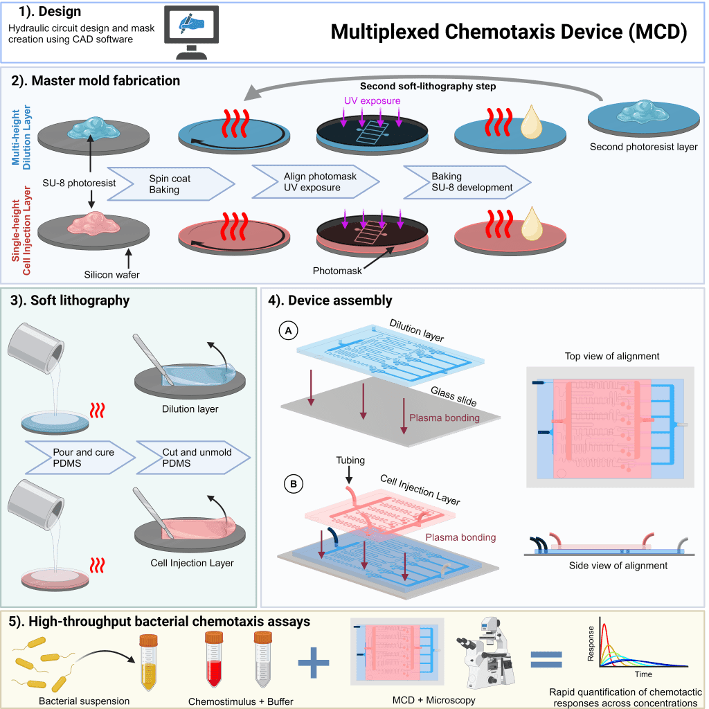This follow-up work from our eLife paper published last year fully documents the extensive fabrication, implementation, and testing of the Multiplexed Chemotaxis Device – a serial microfluidic platform designed to rapidly screen the response of swimming microorganisms to a variety of chemical conditions. A key aspect of any science is the reproducibility of results, and with this protocol paper we aim to open up this technology and make it an accessible tool to the wider scientific community. If you are interested in reading more, the paper is available through Open Access, and is occupying a prime position on the cover of the journal!
