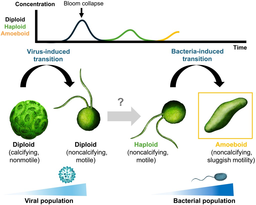 In this work, we characterised a rapid metamorphosis of the single cell, whereby a haploid cell rapidly elongates and drastically alters its swimming patterns. Through an extensive screening panel, we show that this transition is solely induced in bloom-forming coccolithophores when exposed to high bacterial concentrations, in conditions reminiscent of algal bloom collapse. These ‘amoeboid’ cells are capable of persisting long after the haploid phase has succumbed to the harsh environmental conditions generated by the surrounding bacterial population, and presents a potential avenue for the cells to survive and propogate after a bloom collapse. This is another exciting example of how inter-species interactions shape ecosystem-scale processes and events, and opens up new questions in our understanding of these key microbial players.